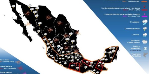 En las próximas horas, se pronostican lluvias muy fuertes para Chiapas, Guerrero, Oaxaca, Tabasco y Veracruz